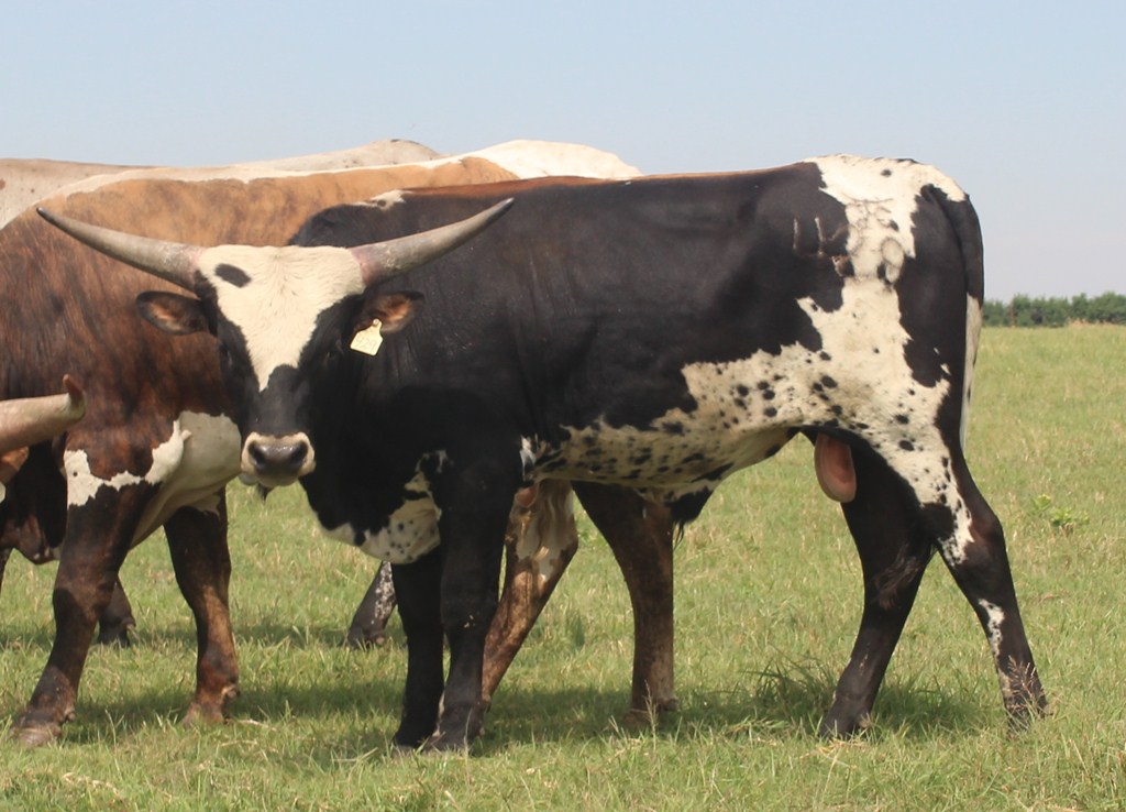 Thick horned, very tall, fancy young bull with the striking Parker Brown coloration. Now owned in partnership with Roadrunner Station Longhorns!