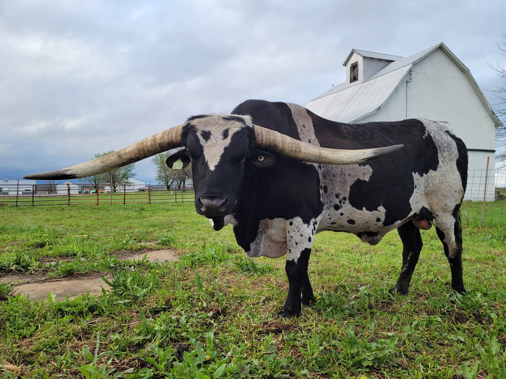 We are thrilled to have this big boy on our farm! Top is a half brother to the $120,000 Queen of Black & White, Saddle Jewel. Incredible backward horn direction like his sire Saddlehorn, dam is a big horned Top Caliber daughter. He throws a very high percentage of black and white calves. He is a gentle guy. He has now hit 90" TTT. Check out his progeny, really nice with crazy back horn direction.